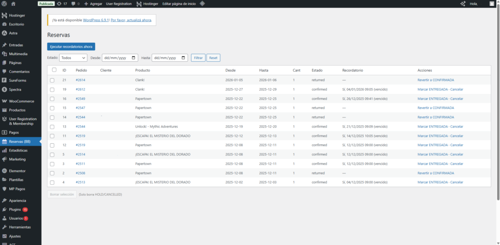 Sistema de gestión de alquileres totalmente integrado a tu web, diseñado para optimizar la disponibilidad y maximizar la ocupación. Permite alquilar por día o semana, calcula el cupo real según stock y reservas solapadas. Genera automáticamente reservas vinculadas a cada pedido con recordatorios incluidos y activa una lista de espera inteligente que notifica a los clientes cuando se libera una unidad. Ideal para negocios que necesitan orden, automatización y control de sus alquileres.